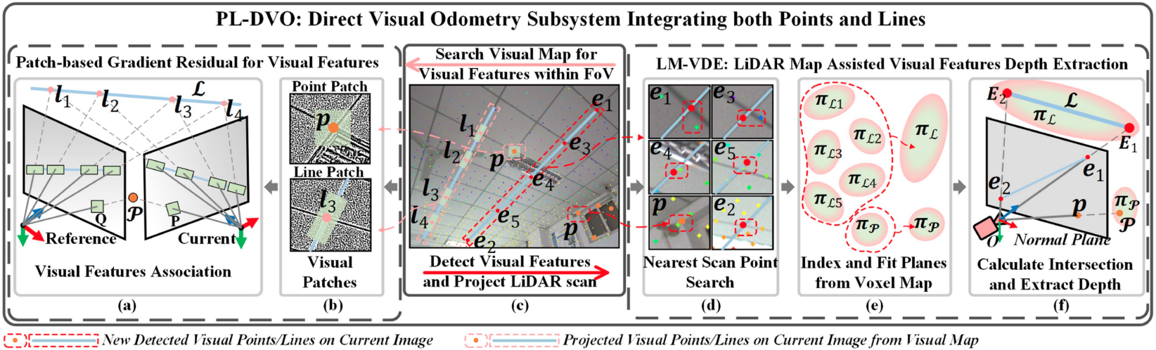 Point-Line LIVO comprises a backbone LiDAR-inertial odometry (blue and gray components) and a direct visual odometry subsystem PL-DVO (red component). Our proposed LM-VDE (green component) method is employed to extract all visual features depth. The data of IMU, LiDAR, and camera are tightly coupled at the observation level.